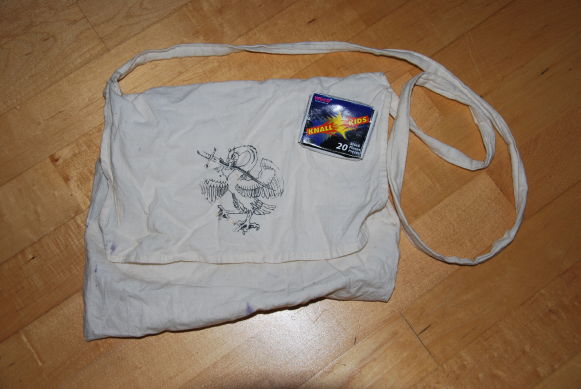 Eine kleine Leinentasche mit Schwan-und-Schwertwappen; Inhalt: Eine Packung "Knall Kids".
