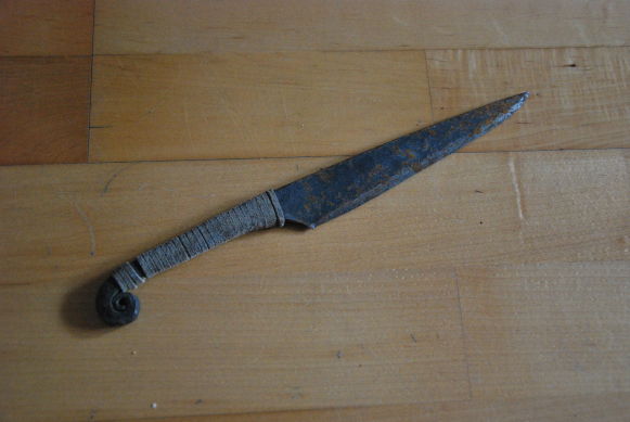 Einteiliges geschmiedetes Messer mit Ledergriffwicklung und Kringelknauf |