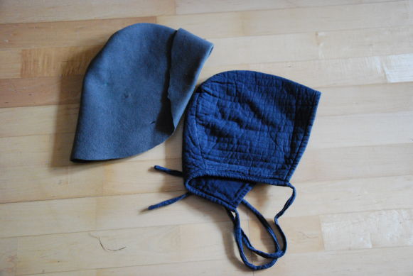 Ein graubrauner Filzhut (Rohling) und eine blaue gesteppte Bundhaube.